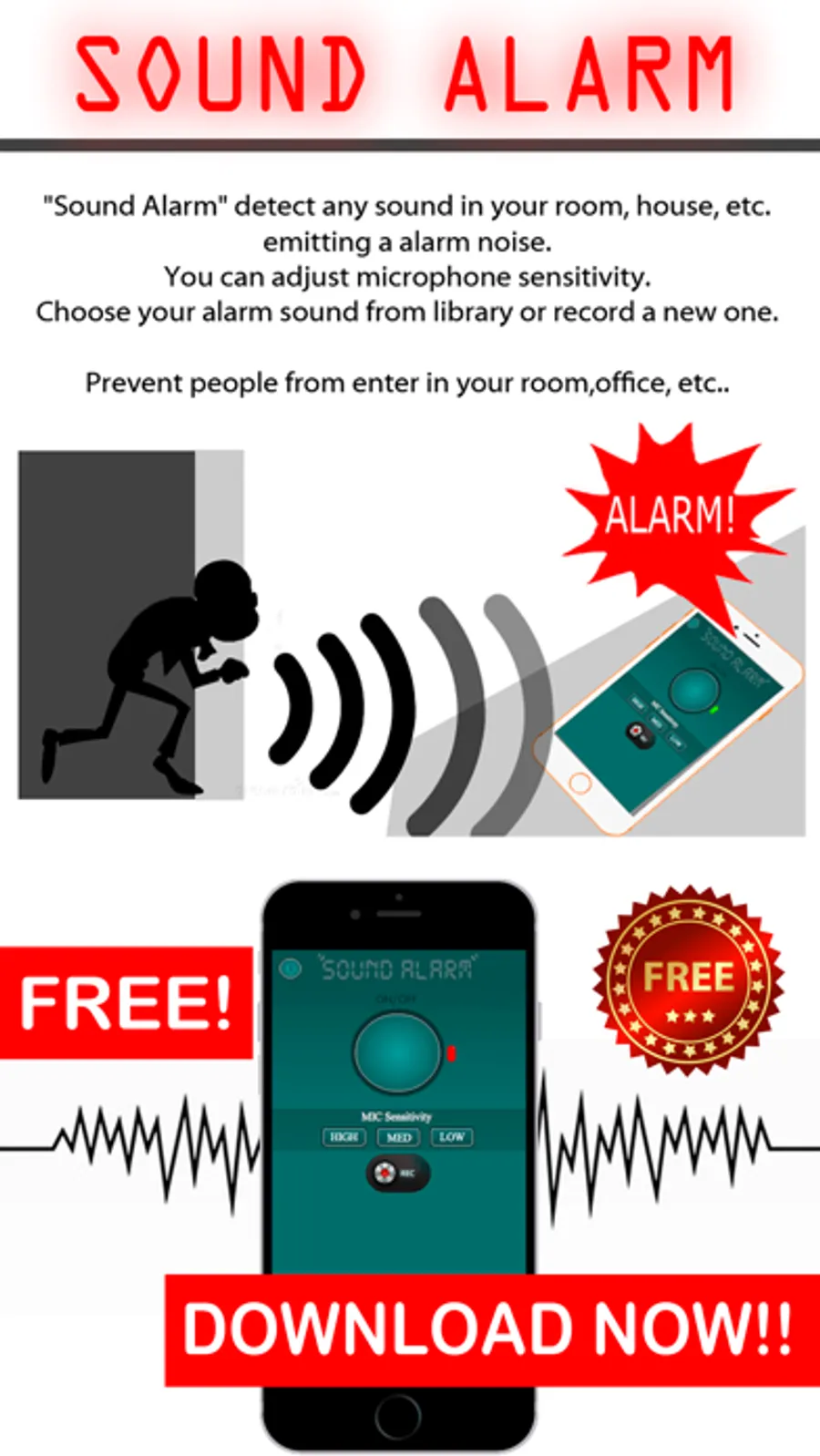 - "Sound Alarm Free" detect any sound in your room, house, etc. emitting a alarm noise.