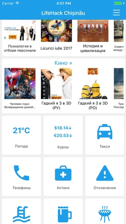 LifeHack Chisinau - городское приложение, включающее в себя ряд сервисов, которые нам необходимы каждый день. На данный момент доступны следующие разделы:
