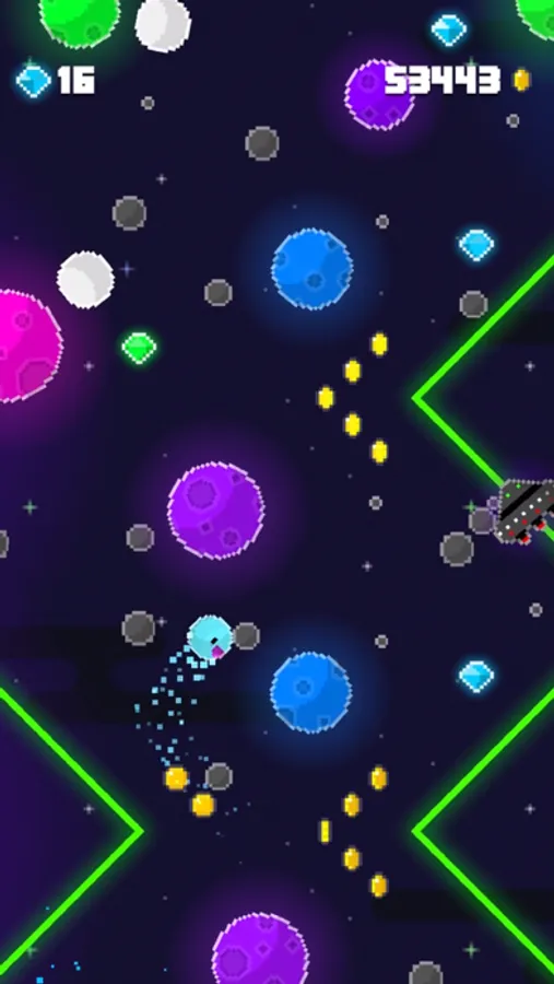 With simple one tap controls all you need to do is tap your way through the infinite depths of space collecting diamonds along your way and avoid tonnes of interstellar objects that are just waiting to smash you right out into the far corners of the universe. The further you get the crazier space becomes with various levels of space, each introducing a new element to avoid.