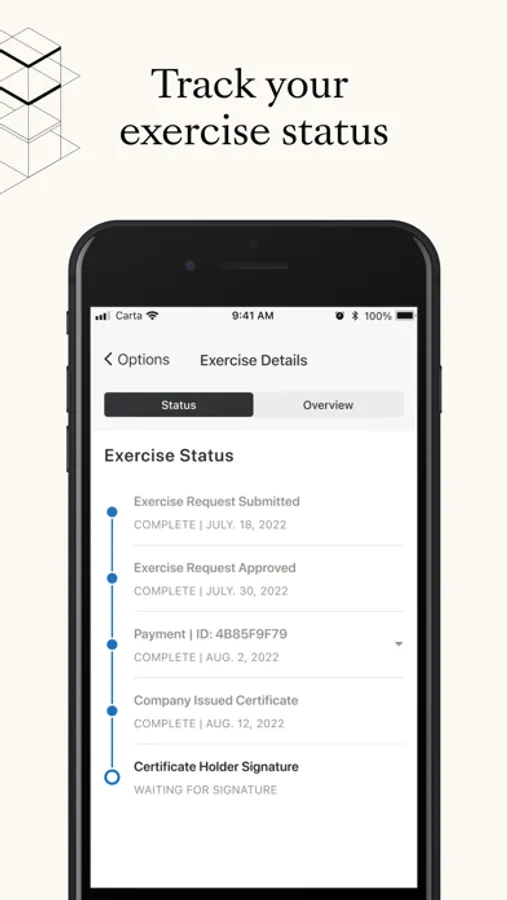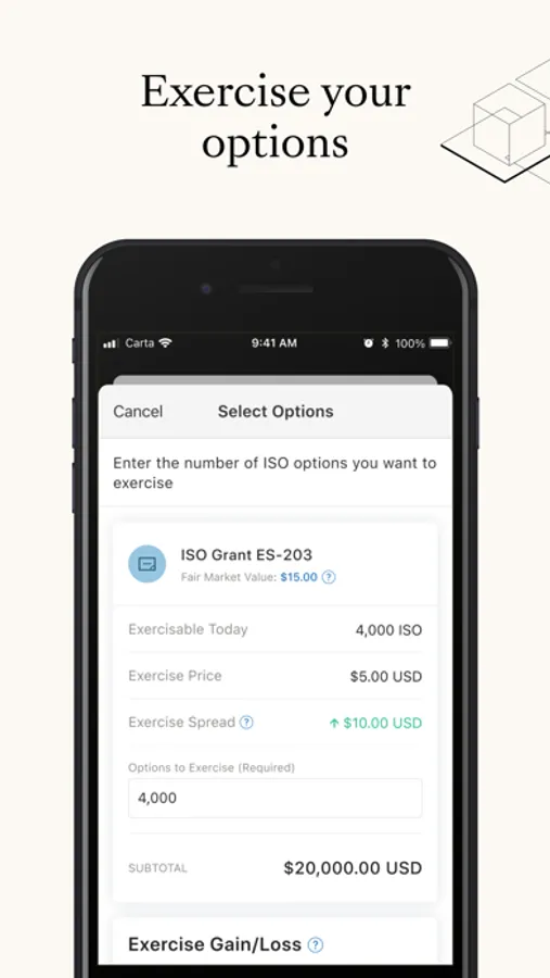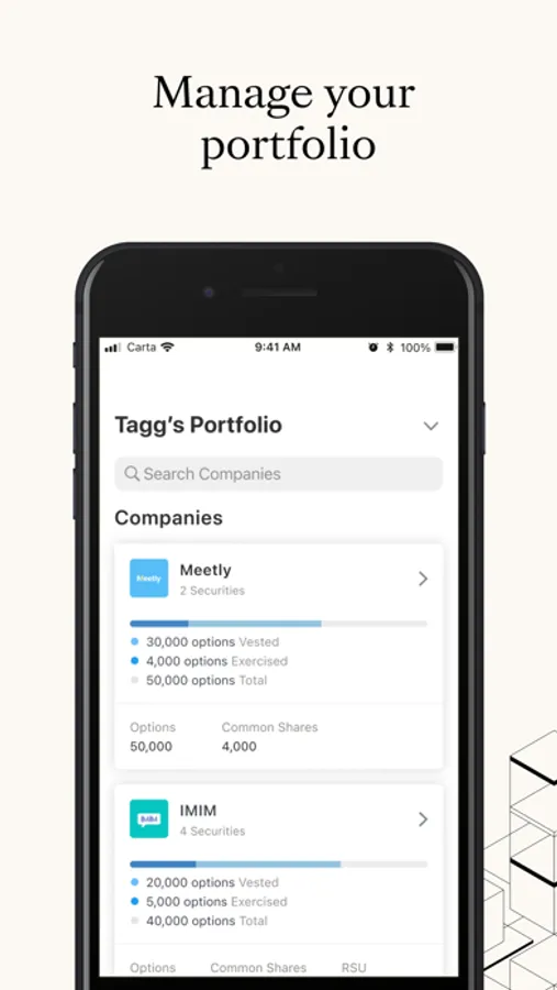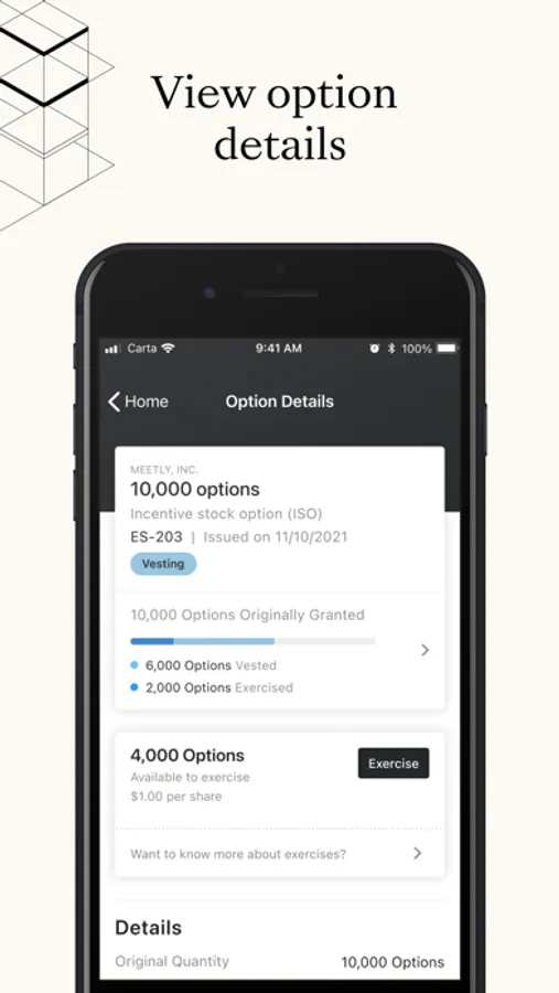 Carta is a platform that helps people manage equity, build businesses, and invest in the companies of tomorrow. Download the Carta app to manage all things equity - from accepting equity grants to exercising your options.