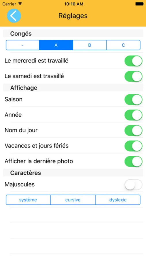 Elle reprend les saisons, les anniversaires des élèves et permet un paramétrage personnalisé (mercredi/samedi, congés, écriture capitale/scripte/cursive).