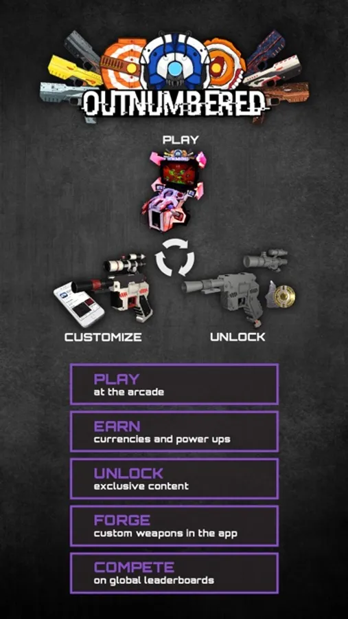 Log in to an Outnumbered cabinet using the app to save your scores and stats, earn Shrapnel and Shells to unlock and purchase new content and power ups, forge your own custom weapons that you can use in Outnumbered and post your scores to the global leaderboards.
