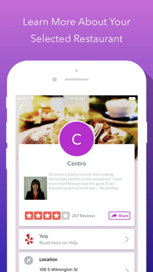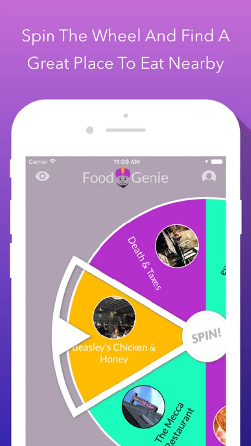 Food Genie uses your location to find 20 restaurants near you and then randomly places 6 on the Food Genie wheel. Take a spin and say goodbye to the "I don't know" moments of deciding where to eat. Let Food Genie be your unbias third-party in helping you decide where to eat. Now finding a new restaurant or pub is fun, easy, and reliable thanks to Food Genie and restaurants provided by Yelp©. Taking a chance could not be more rewarding.