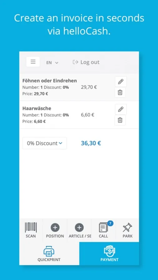 helloCash works on your smartphone and tablet. When using the helloCash app you always have your cash register with you and there is no need to buy expensive additional hardware and we guarantee that you will always enjoy the latest updates.