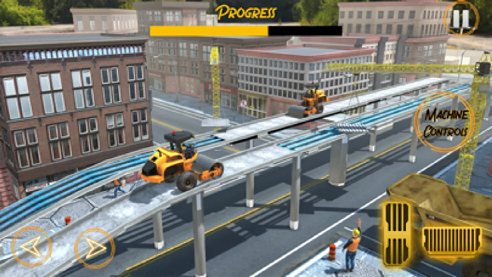 Build roads and bridges for the new city. Your goal is to construct a modern city. Operate heavy machinery like hydraulic lifter, excavator, bulldozer, transport truck & road painter to perform each step in road and bridge construction. Drive, park, transport material and control heavy machinery in this construction simulator game.