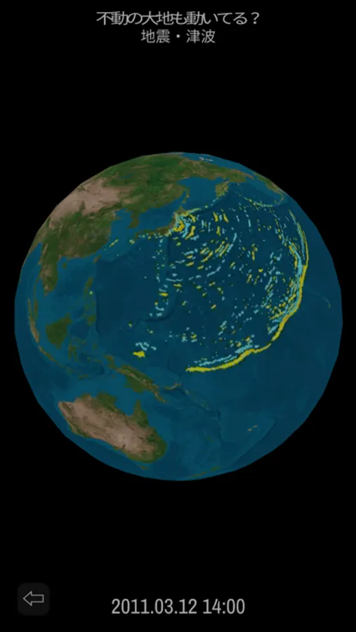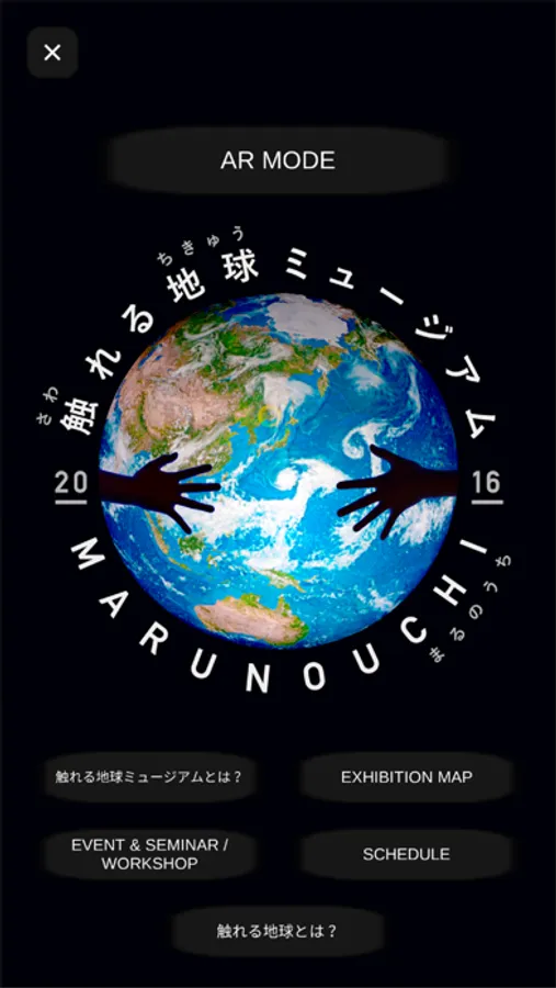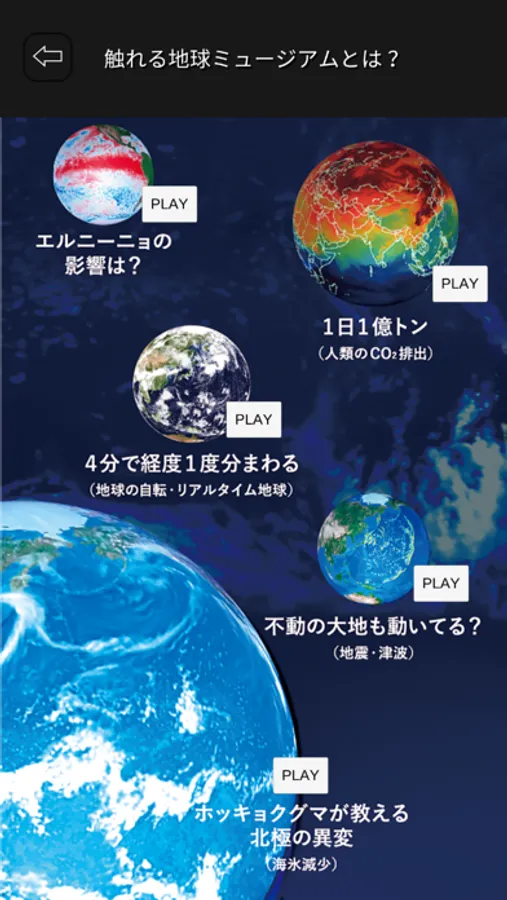 その展示内容のプレビューとして、配布リーフレットから「飛び出す絵本」のように生きた地球のさまざまな姿を見られるようにしたのが、このARプログラムです。(地球をめぐるCO2、地球温暖化の未来、津波、生物の地球移動など)