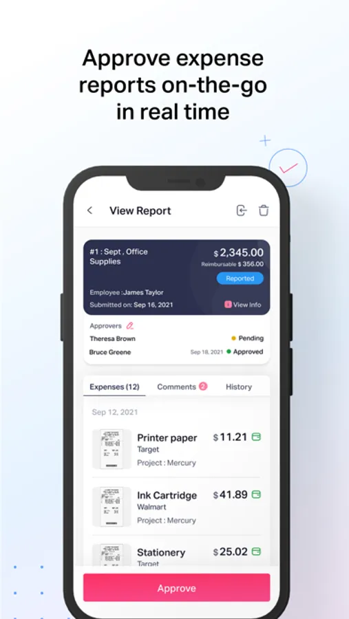 If you are a team manager or an admin, you can approve expense reports for your employees on the move or send them back to them with comments.