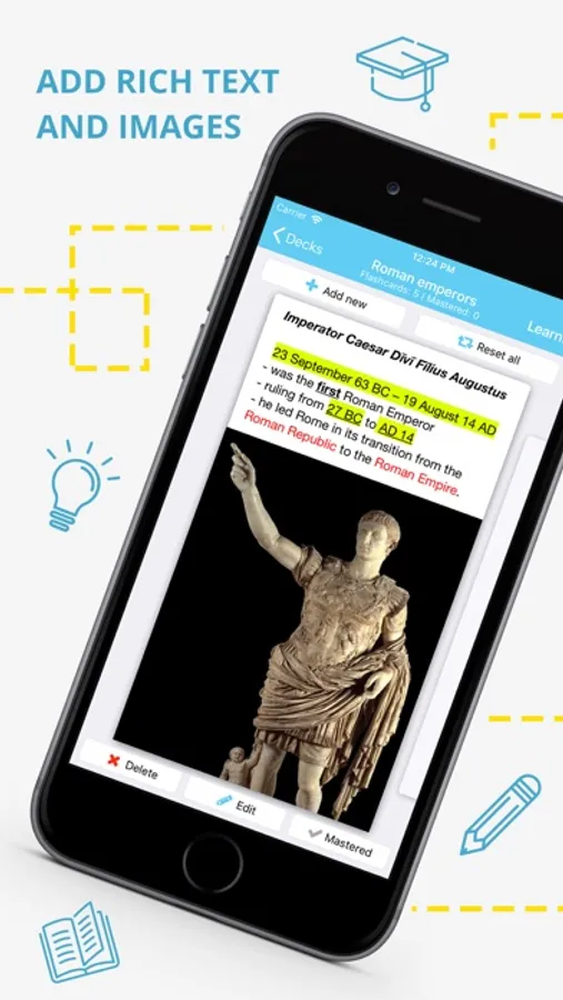 - Flashcards app can have images and rich text on both sides of flashcard. Load pictures from your photo library.