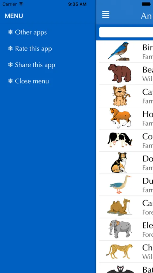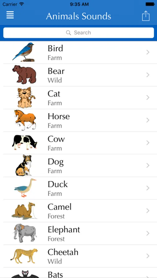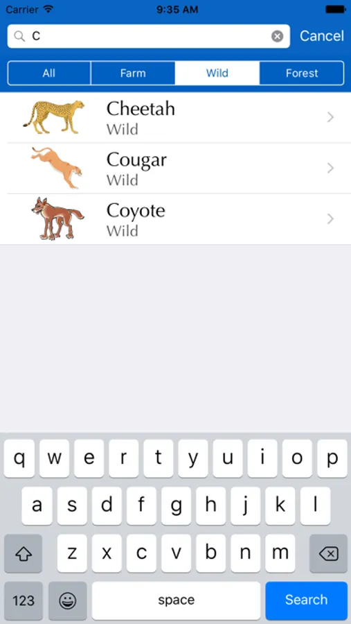 **You can do search in animal list by categories. They are Farm,wild and forest.