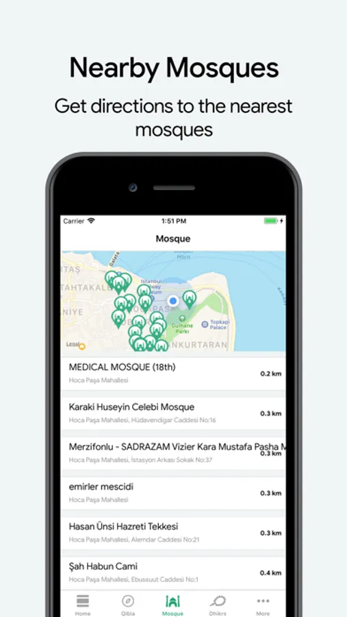Nearby Mosques: You can see the Mosques and Masjids closest to your location on the map.