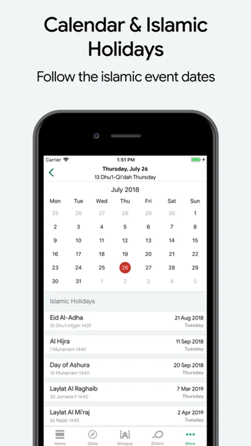 Hijri Calendar: You can follow the dates of important islamic days such as Ramadan, Laylat-ul Qadr, Eid al-Fitr and Eid al-Adha.