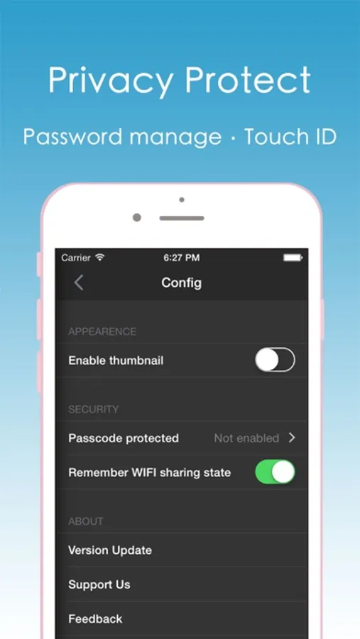 * Upload/download files by using web browser in computer via Wifi connection. And you can enable http access password to protect the privacy