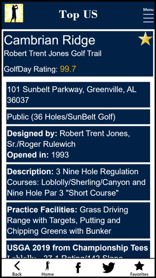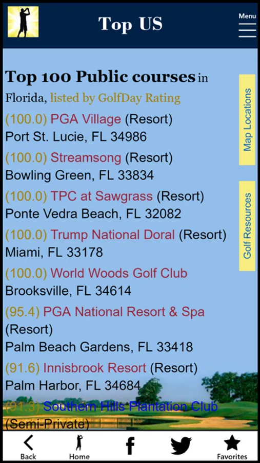 GolfDay Top US includes almost 15,000 golf courses in the United States, with a GolfDay Rating and proximity search making it easy to find a great track near you or where you plan to be. Listings also include rates, booking links, course detail, golf league and Junior golf information, mapping/directions and local weather. Don’t waste your valuable time at a Dog Track!