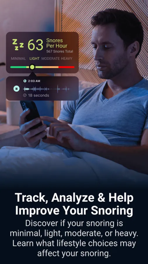 • Snore Tracking: Record your snoring (minimal, light, moderate, or heavy) and learn what improves your snoring.