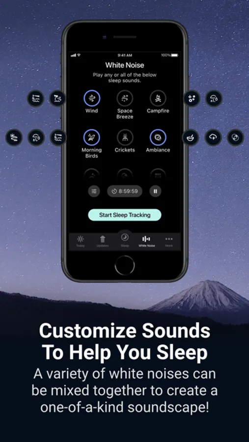 • Customizable White Noise Library: A variety of sounds that can be mixed to create a one-of-a-kind soundscape!