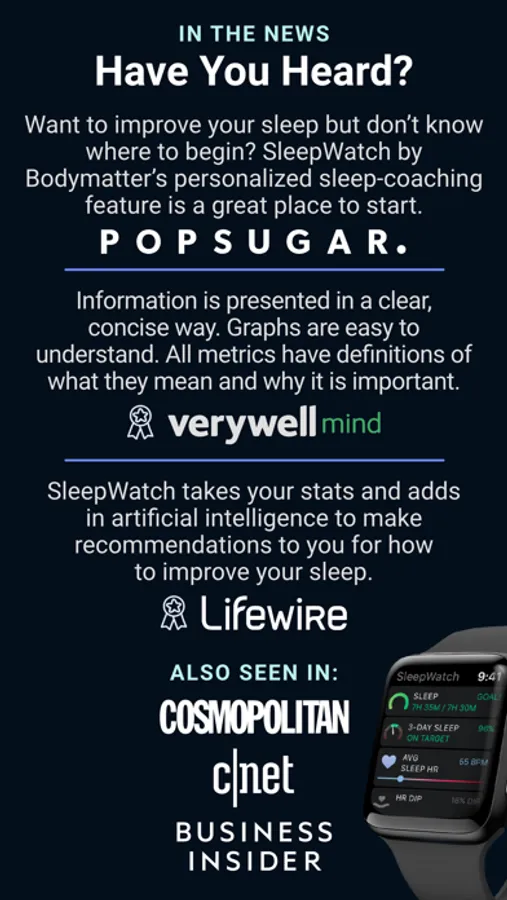 Welcome to SleepWatch, a better way to track, hack, analyze, and help improve your sleep. Ever wondered if you talk in your sleep? Constantly wake up feeling like you need more rest? Trying to understand your snoring? Your best sleep is made, with SleepWatch.