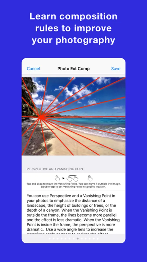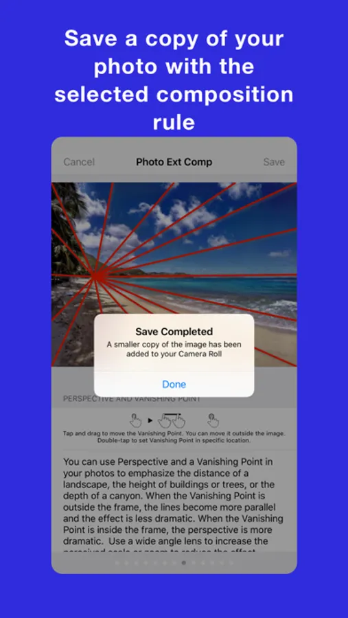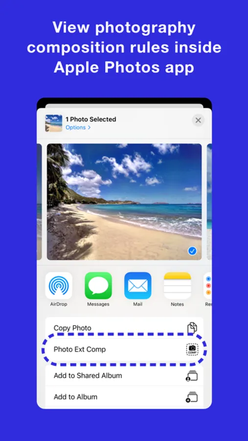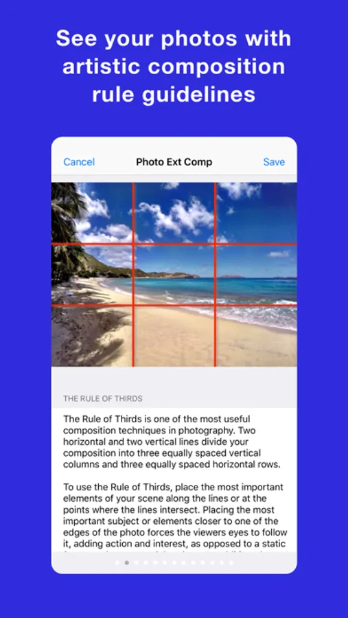 Photo Extension Composition overlays over 10 artistic photography composition rules on photos stored in the Apple Photos app for iPhone and iPad. This extension is great for photographers who want to become better at photograph composition. The extension also shows, advises, and guides you on how to understand each composition rule to be a great photographer!