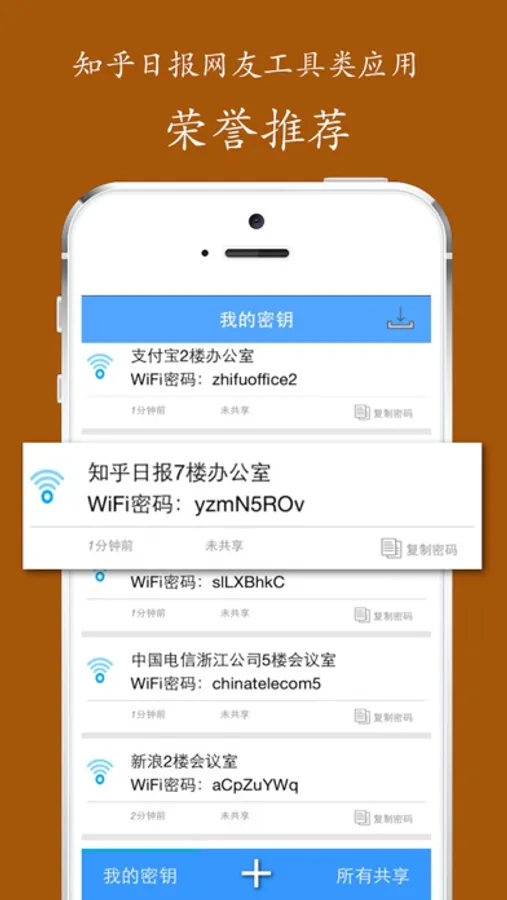 WiFi密码-密钥生成和共享是基于朋友、熟人、公司、家庭间分享经济模式而推出的免费上网模式,能够帮助用户自动查询熟人间共享出来的开放WiFi热点信息,必备的Wifi免费上网工具。