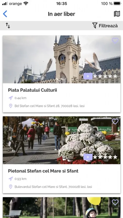 Toate elementele pot fi sortate alfabetic sau dupa distanta. De asemenea, se pot folosi optiuni de filtrare, in functie de tipul de punct de interes.