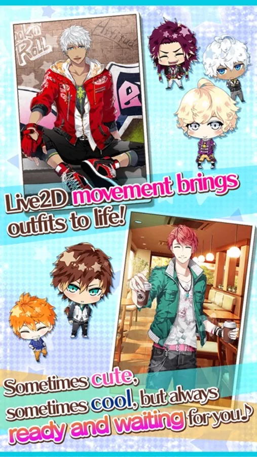 Plus, moving outfits give a whole new dimension of interactivity! With Live2D's Motion Technology, watch him move and react to your conversations, touches and even... kisses...?!