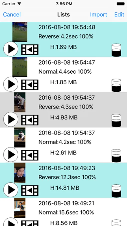 It lists reverse/original video files with shooting date and time, normal/reverse identifier, playback speed and capacity of the video file.