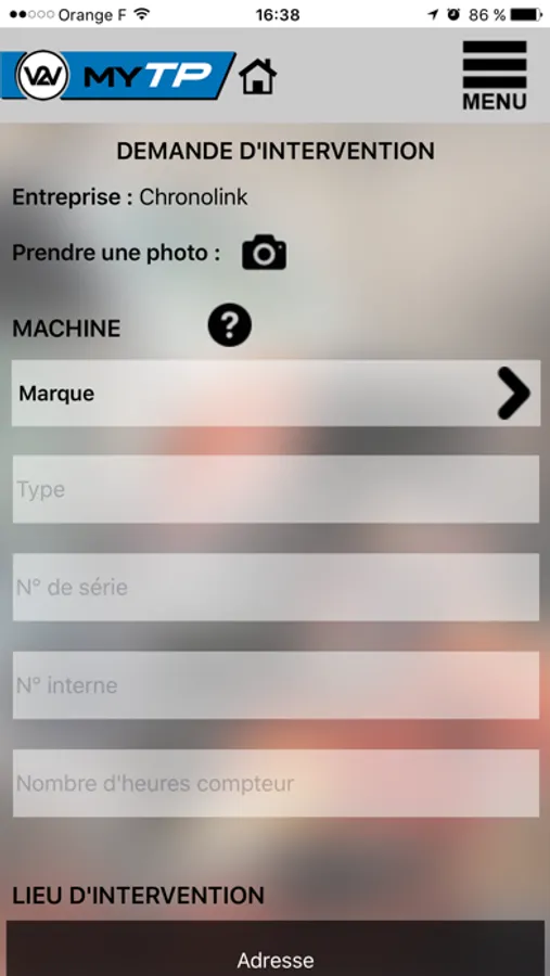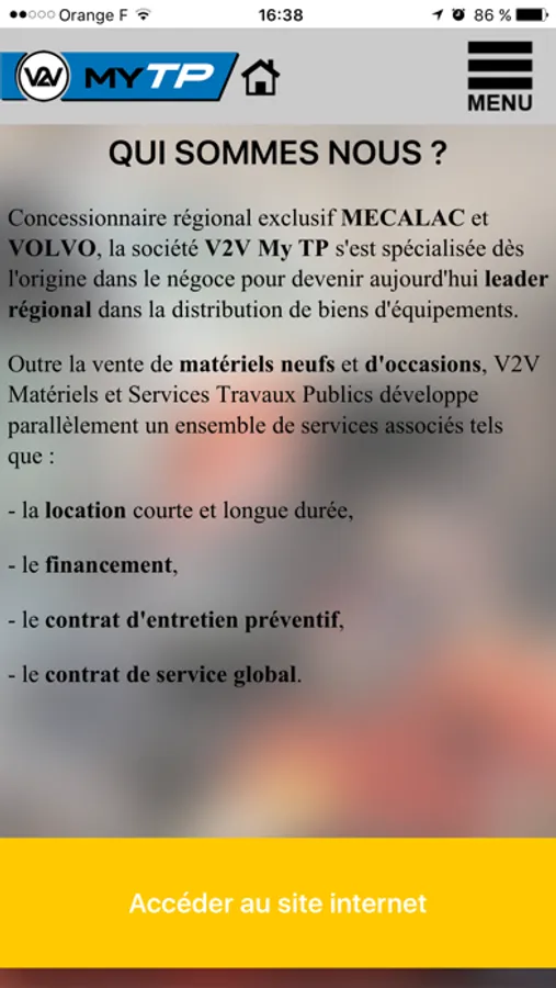 My V2V vous permet d'effectuer et de gérer directement une demande d'intervention auprès de trois entreprises du groupe V2V : V2V MY TP, V2V MY MANUT et V2V MY VANDEL. L'application comprend :