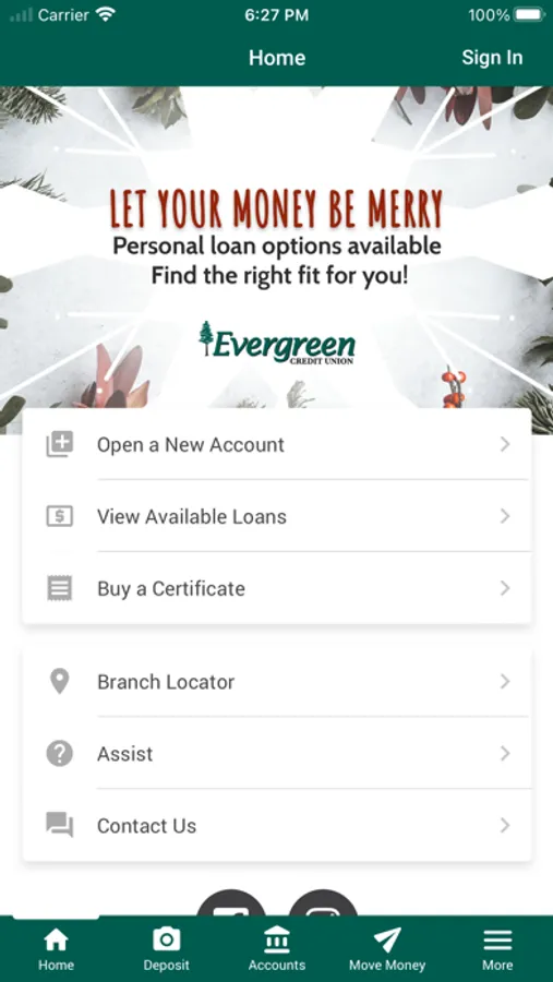 Evergreen Credit Union Mobile provides members convenient access to our website, mobile banking, branch and contact information.