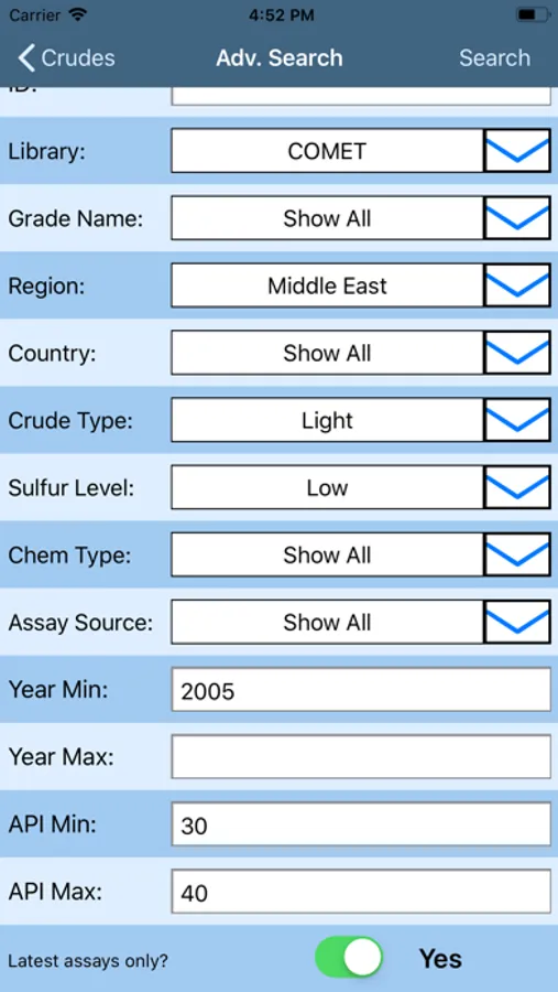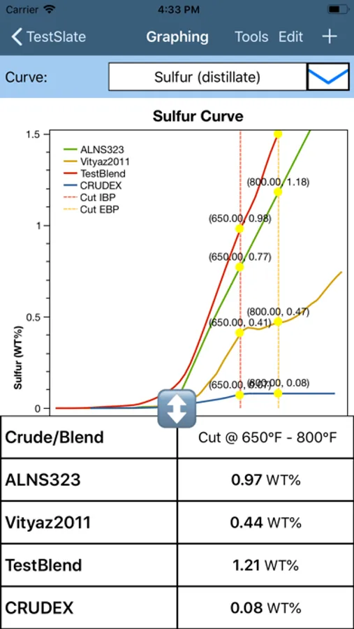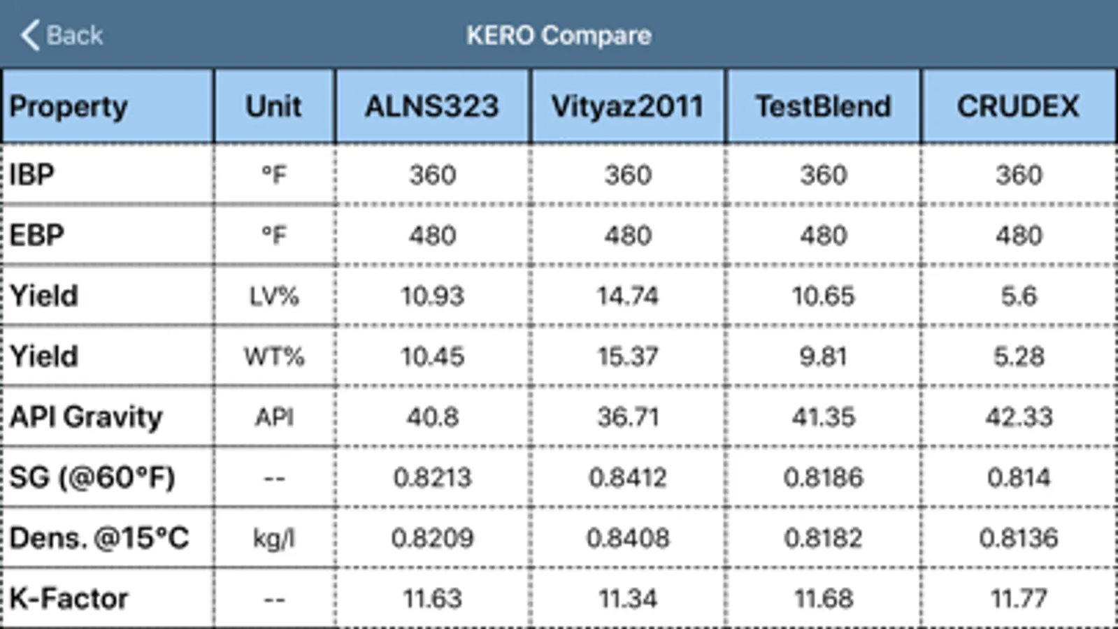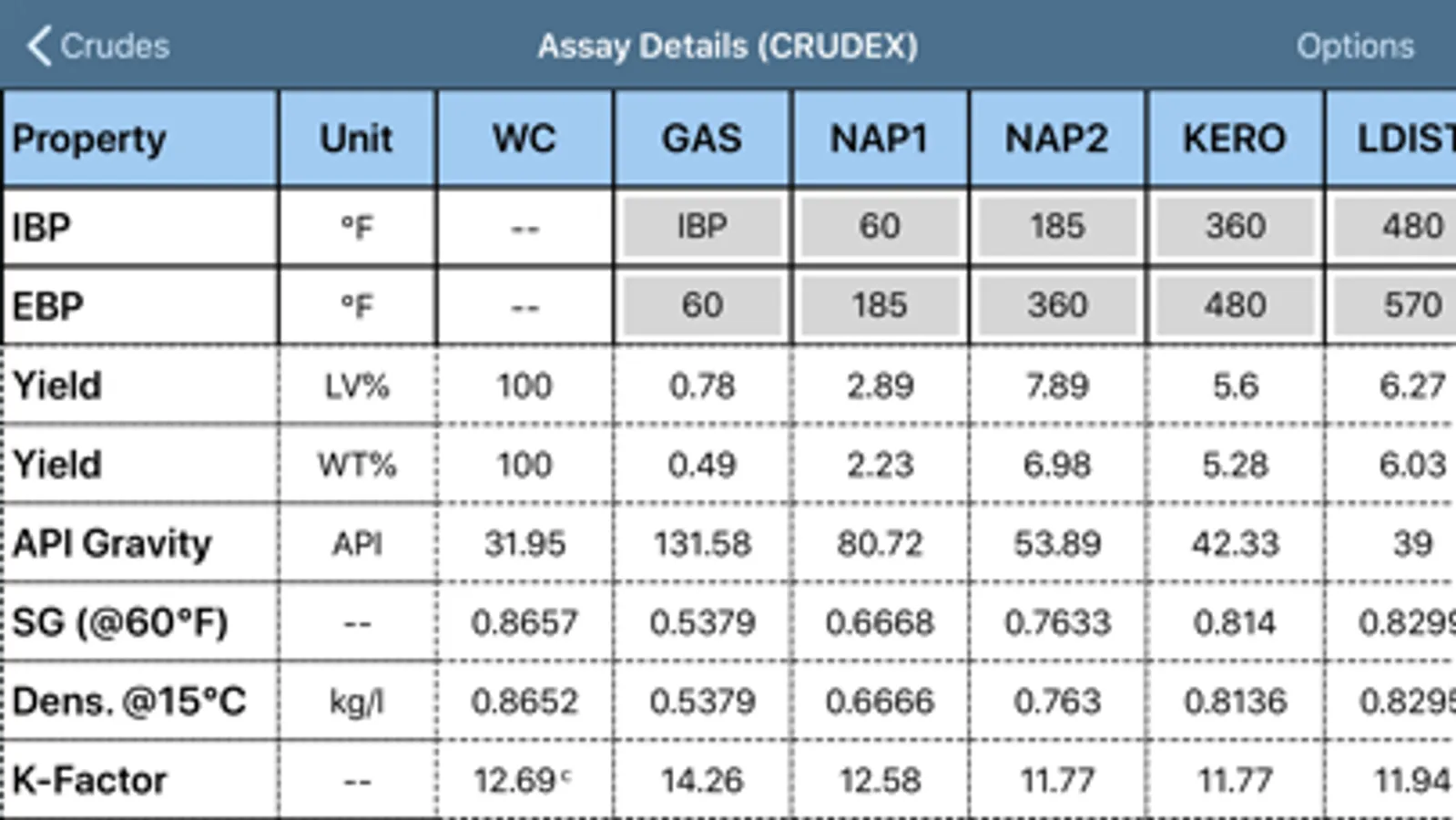 Users have several search filters they may use to find the perfect assay and view detailed assay data. Assays can be re-cut with H/CAMS technology by editing the gray boiling point fields, or with a saved cut set. Users can also create and modify cut sets (with or without tray inefficiencies). In addition, users can access and modify existing slates or create new ones. Slate operations such as cut comparisons and group graphing can be done on a slate. H/Comet Mobile also supports blends, so users can access (and modify) existing blends as well as create new ones. Finally, assays can be graphed and then analyzed with value/cut lookup tools.