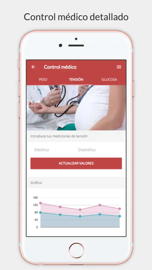 De manera autónoma, la paciente podrá registrar su peso, tensión y valores glucémicos. Dispondrá de detallados gráficos de control que garantizan una ganancia de peso saludable.