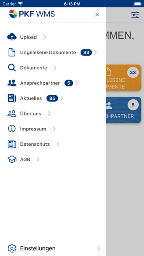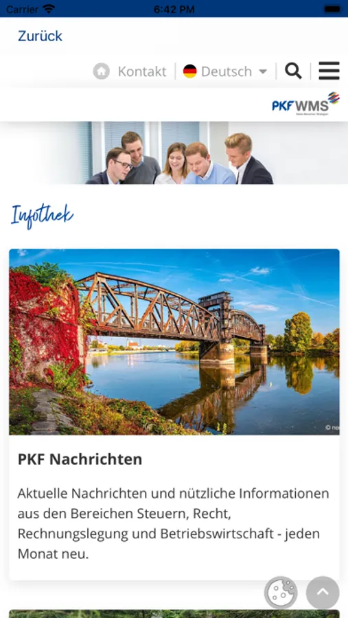 Aus einer Hand. Mit der kostenlosen PKF WMS App erhalten Sie Einladungen zu unseren Veranstaltungen, können Ihren nächsten Steuertermin planen, Ihre Buchungsbelege einsehen, Ihren persönlichen Ansprechpartner kontaktieren oder sich über aktuelle Steuer- und Rechtsthemen informieren.