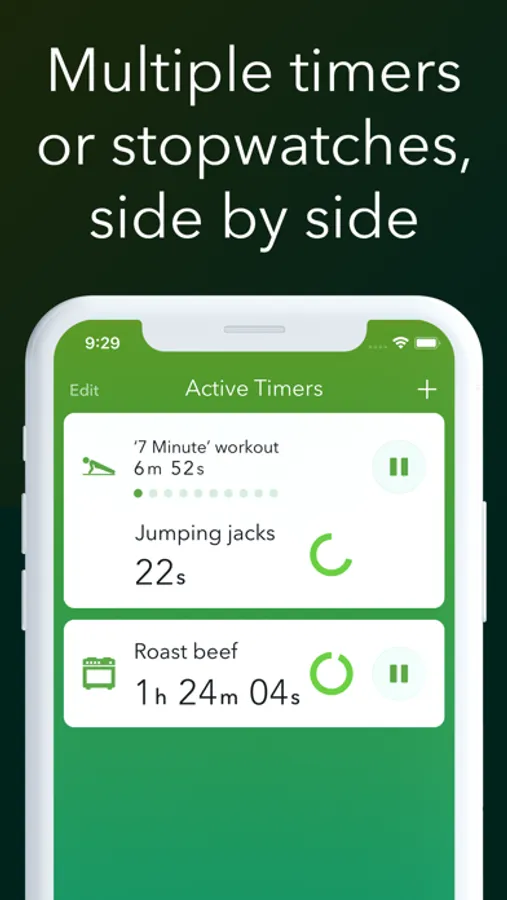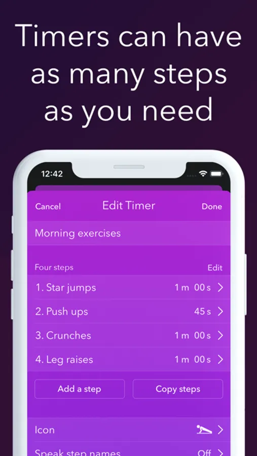 ● Multi-stepped timers - Timers can have multiple steps, where each step has its own duration. This is great for workout routines and cooking.