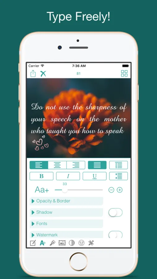 تطبيق Type Freely يوفّر لك إمكانية تصدير النص المكتوب كصورة عالية الدقة ومشاركتها حيث تشاء.