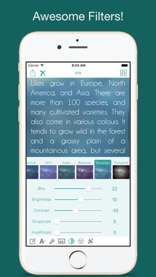 • Custom text: font, size, color, style, and background photos