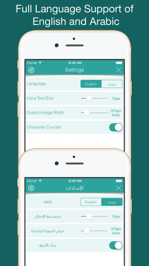 • توفر إعدادات للتحكم باللغة، حجم خط الإدخال، عرض الصورة المنتجة وعداد الأحرف.