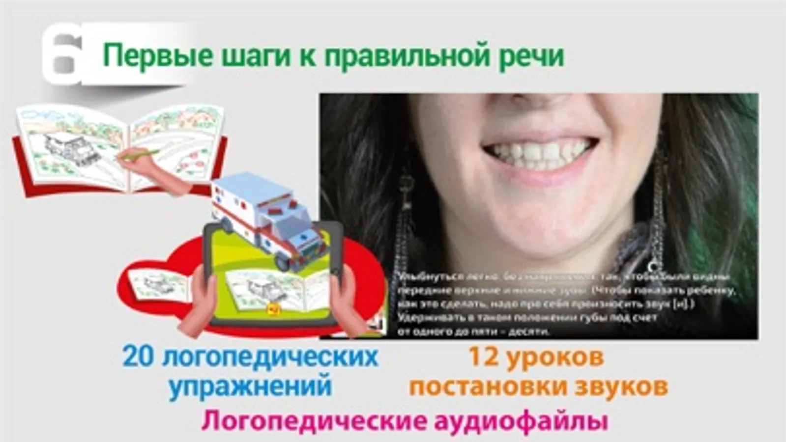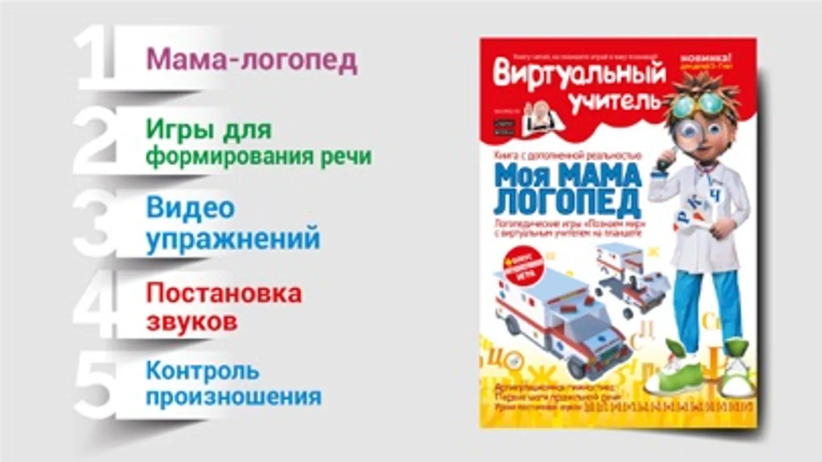 Игра для формирования речи ребенку – «Логопед. Книга с виртуальным учителем», помогает граммотно научить ребенка говорить и развить у ребенка речь. Структура издания предполагает использование игрового материала ребенком самостоятельно или совместно с родителями. Если ребенок играет сам, то его виртуальный учитель Danik оживляет раскрашенные предметы, показывает их составные части, рассказывает познавательные истории и во время игры формируется правильное произношение звуков происходит обучение ребенка говорить, формирование речи. У ребенка появляется стимул заниматься и учиться, поскольку для прохождения игры ему нужны новые герои, открыть которых он может, лишь пройдя очередной урок постановки звуков. Это шанс научить ребенка красиво говорить.