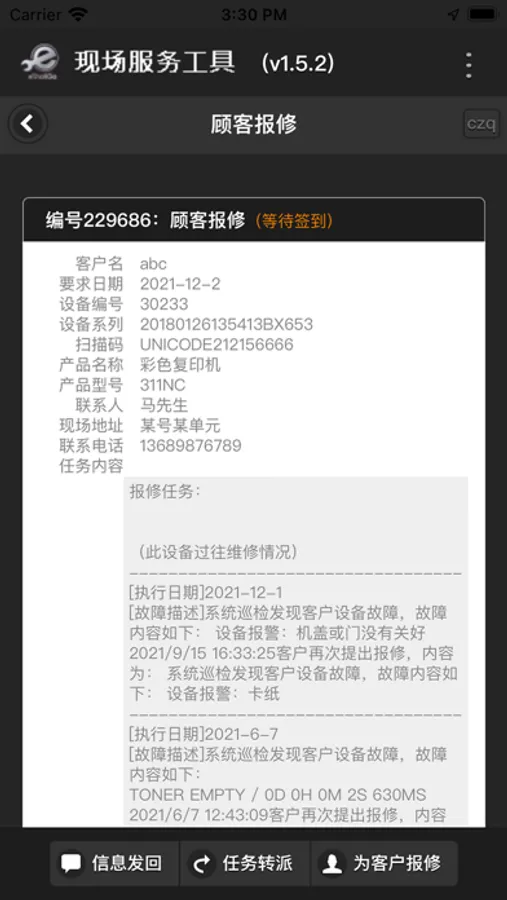 专业用于OA及家电行业集团企业的工程师执行现场落地服务的的移动网络支持应用。是多地、多分公司的大型集团企业的落地服务解决方案的一部分。本程序可以用来指挥分布在全国各地的现场工程师完成或承接OA、IT以及家电设备的维修、调试、客户走访任务。支持工程师实现执行多种其他现场任务比如送货、送单,并可以进行设备扫描(各种条码、二维码)登记、设备数据报送作业,支持工程师现场定位、现场接单、现场任务转派,并可与系统后台管理员实时交互。