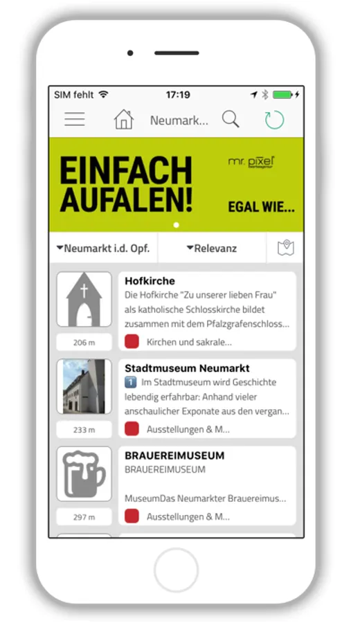 Die NM App beinhaltet MEHR als eine gängige City App. Ob Veranstaltungen, Konzerte oder Volksfeste, in der NM App findest Du alle wichtigen Informationen und Termine zentral für den gesamten Landkreis. Von Berg über Berching bis Dietfurt oder von Freystadt über Mühlhausen bis Parsberg, spiegelt sich die Region in ihrer ganzen Vielfalt wider. Erkunde die Innenstädte im Landkreis Neumarkt neu und entdecke MEHR mit der NM App.