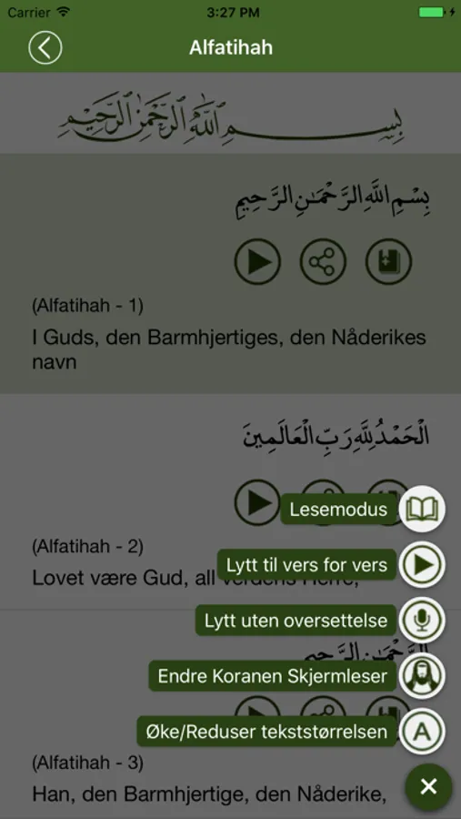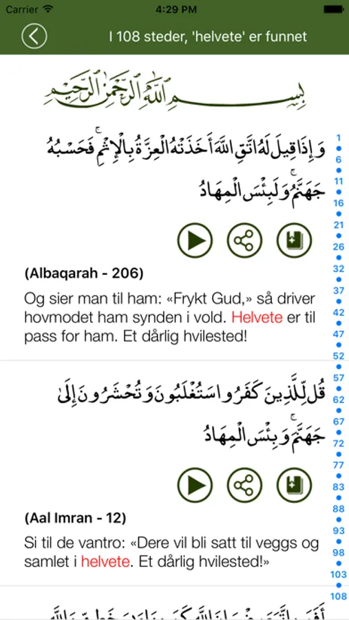 Alle vet at det er totalt 6236 Ayats i Koranen og en leser vil få ti sawab for hver bokstav av Koranen. Resitasjon av den hellige Koranen Sharif: "Det er ingen tvil om at Koranen er den beste guiden i denne verden". Vårt "Koranen på Norsk bokmål" søknad opprettholder den måten som boken form av Koranen opprettholder seg selv. Så en leser kanskje ikke møte noen problemer i den tiden av resitasjon. Derfor, med ære og respekt, kan du holde det å lese gjennom vår "Koranen på Norsk bokmål" program som som når du leser bok Koranen Sharif før.