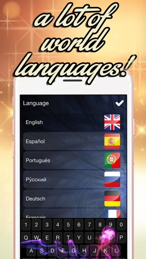 ◆ Select a language and get a English keyboard, German, Italian, Spanish, Russian, Portuguese or Turkish keyboard. Type love messages in the most romantic language in the world by choosing a French keyboard pro!