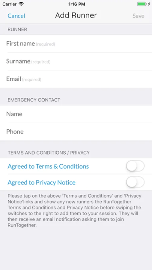 The RunTogether Group Leader App is designed for run leaders who want a simple way to keep track of the sessions they are running as well as recording all relevant data of their participants.