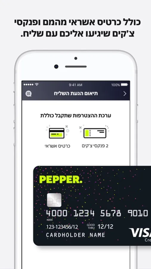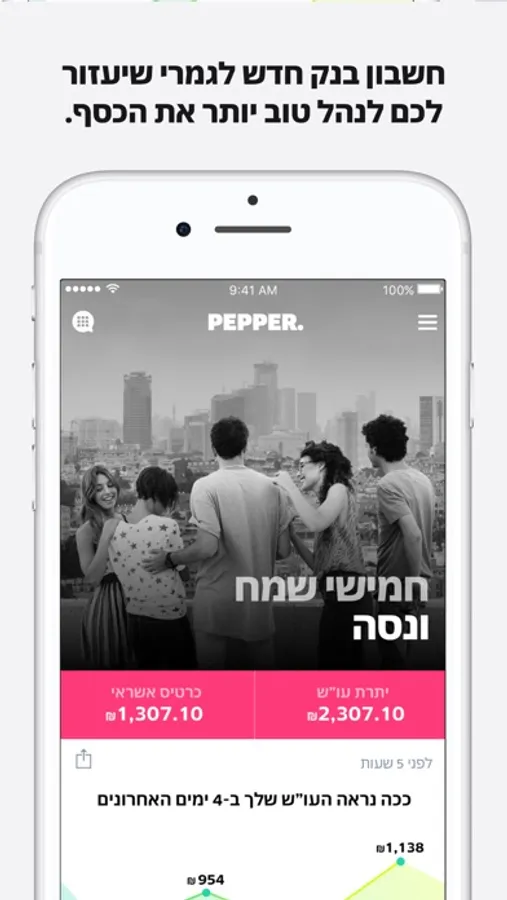 כולו במובייל, בשפה שלכם וכולל את כל מה שאתם צריכים כדי לנהל את הכסף טוב יותר (כן, גם כרטיס אשראי ופנקסי צ'קים). ב –Pepper אתם לא משלמים עמלות עו"ש, הוא נמצא שם בשבילכם 24/7 עם שירות תמיכה אנושי מסביב לשעון, רק לא בשבת, ומלא בהתראות ועדכונים שיעזרו לכם לנהל טוב יותר את הכסף.