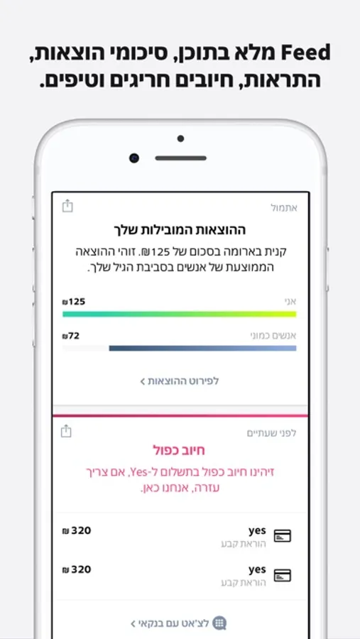 • פיד מלא בתוכן: כתבות, טיפים, התראות ב– Real Time על חיובים כפולים או גבוהים, השוואות לאנשים עם הרגלים כמו שלכם או שמרוויחים כמוכם, סיכומי הוצאות בסופי שבוע או חופשות, תובנות, עדכונים ומה לא. וכל זה כדי שתוכלו לנהל טוב יותר את הכסף ואפילו לחסוך.