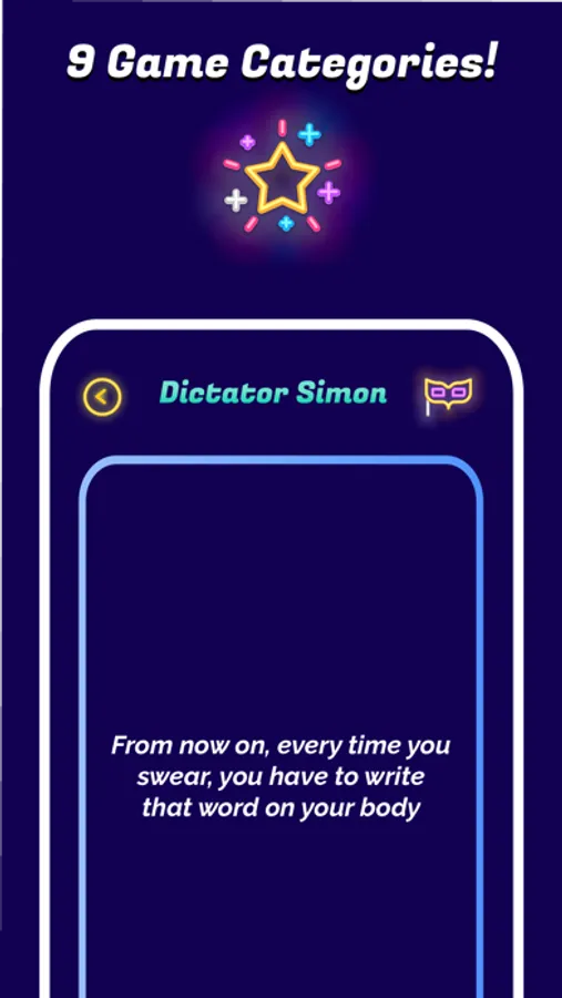 Dictator Simon---------- You’ve never played Simon Says like this! Crack open a few bottles and follow the rules of this intense drinking game that put you at the mercy of some very conflicting instructions. Will you do what it takes or drink and pass?