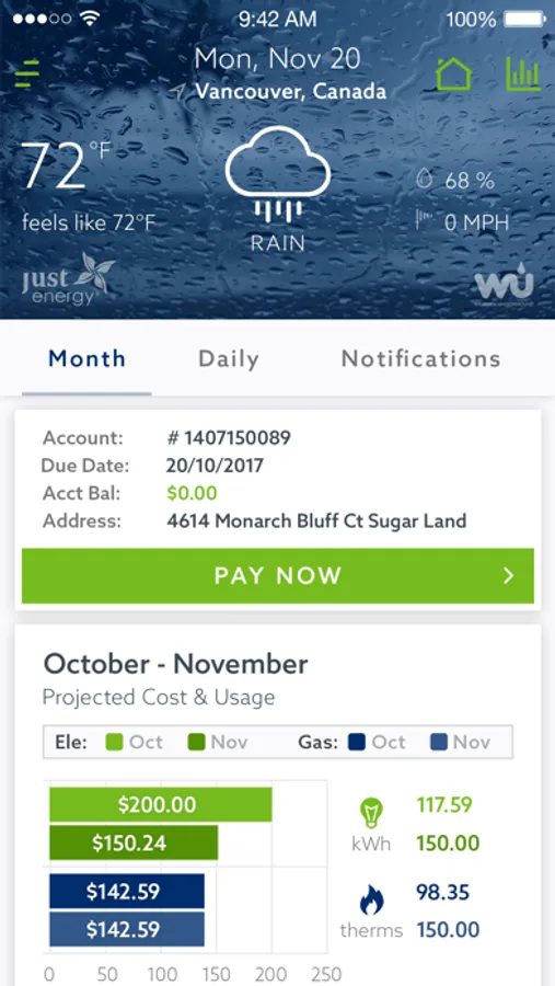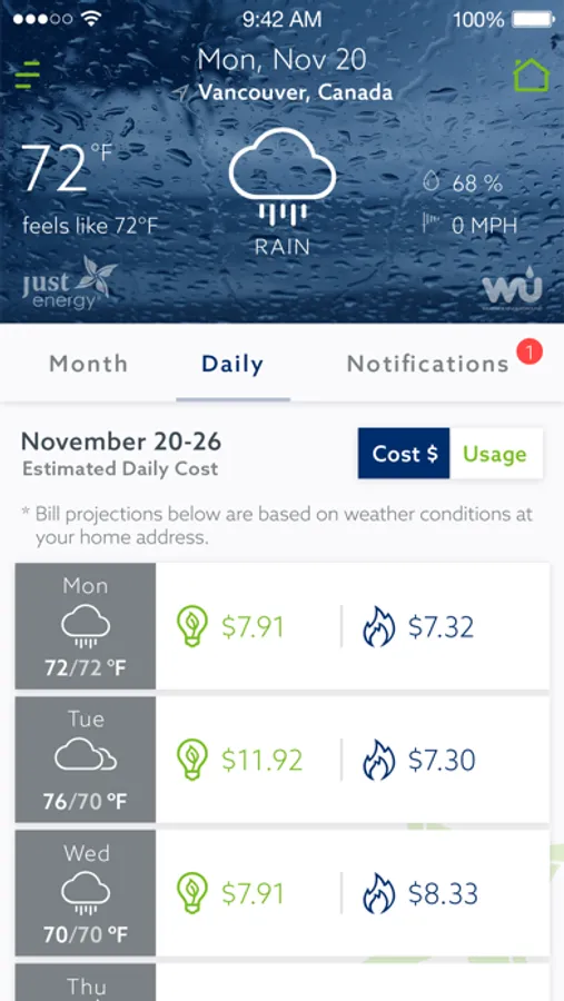 The Just Energy Advisor app uses sophisticated algorithms to provide users with energy bill projections based on local weather forecast and historical energy usage.