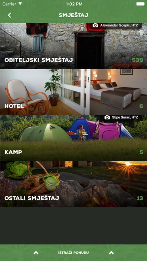 Smještajni objekti (obiteljski smještaj, hoteli, kampovi, ostali smještaj) - pregled svih važnih informacija kao što su kontakt podaci, opis, fotografije, kapaciteti, prikaz na karti te pronalazak puta do odabrane lokacije. Filter smještaja korisniku omogućuje lakši pronalazak odgovarajućeg smještaja prema željenoj lokaciji, vrsti smještaja, kapacitetu i broju zvjezdica za više od 500 objekata obiteljskog smještaja.