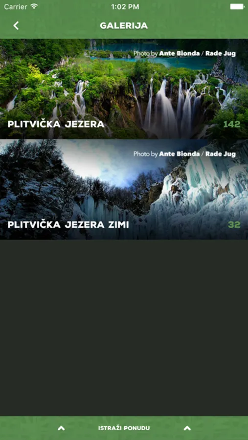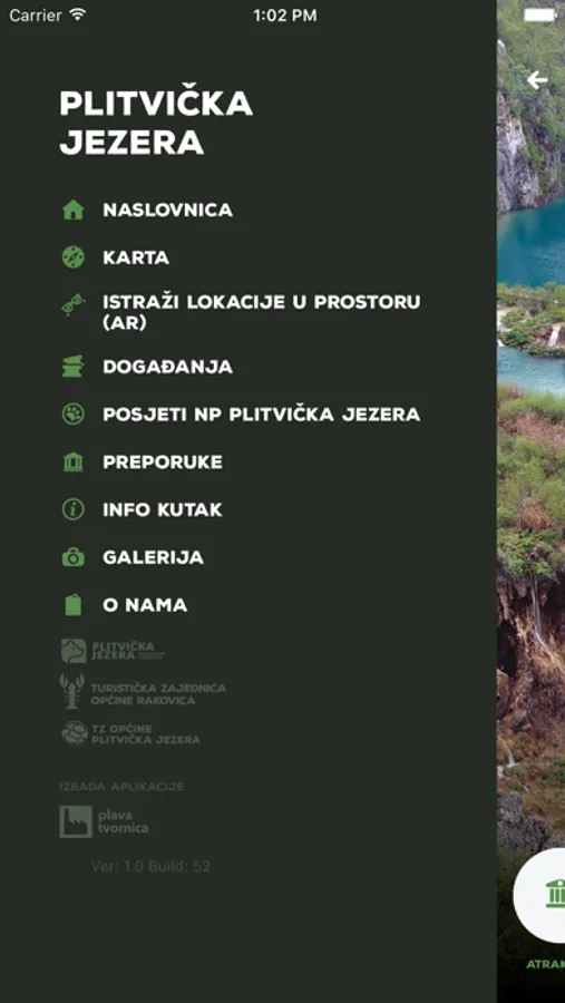 Posjetite NP Plitvička jezera - nudi sažeti pregled informacija koje aplikacija nudi: ruta, galerija, cjenik, uz mogućnost da korisnik sazna više odabirom pojedine sekcije.