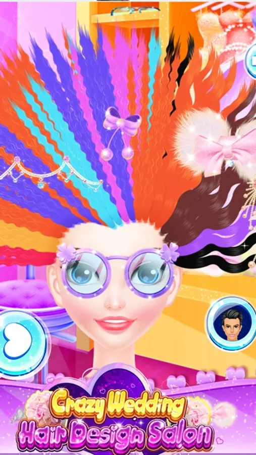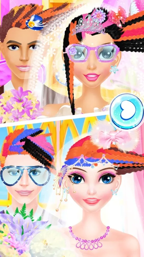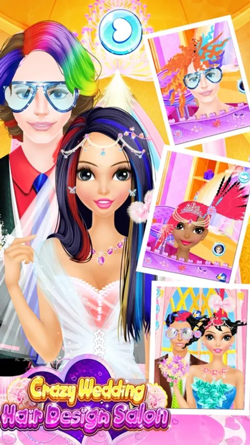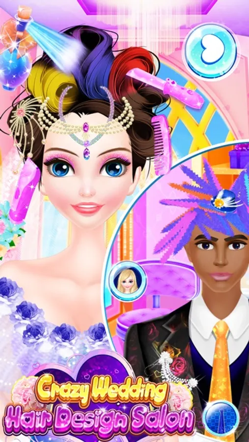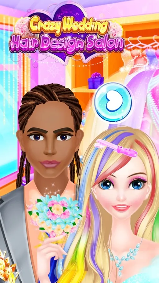 Come to our brand new hair design salon today. Here you will have the opportunity to help different loves design crazy wedding hairstyle for them. That sounds great. Join us and firstly choose girls and boys that match closely. You can match the girl with different boys and if they are well matched, then you will see the shape of heart soon. Boy and girl will also have close actions. If they are not matched, then you will not see close actions between them. Secondly, you can try your best to design hairstyle for the girl and boy. Clean their hair and then dry for them. Use the shear, curling iron to make the most crazy and fashion hairstyle for them separately. You can also dye their hair with the color that you like. Click the shift button to design both girl and boy. After hair design, you can decorate their hairstyles with sunshine glasses or other hair accessories. Thirdly, dress up girl and boy with wedding dresses and accessories to make them look nice for the wedding. Show us beautiful bride and handsome groom at last.