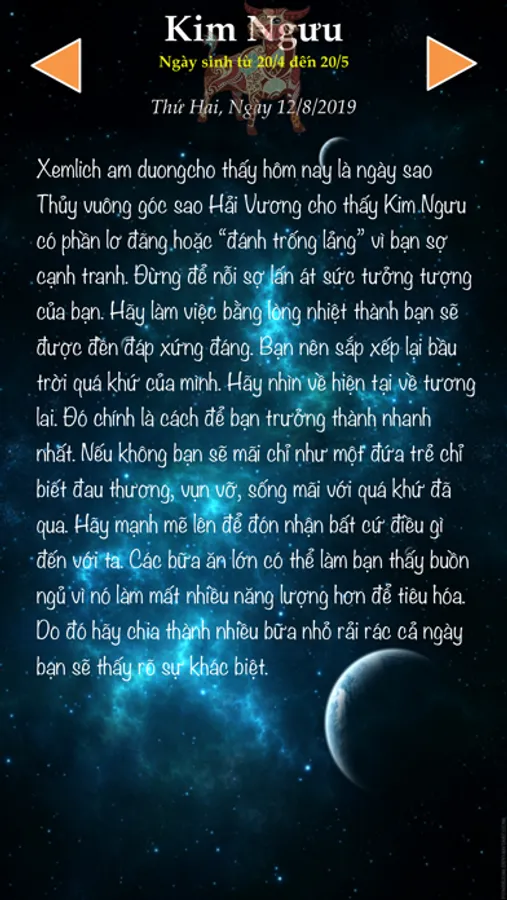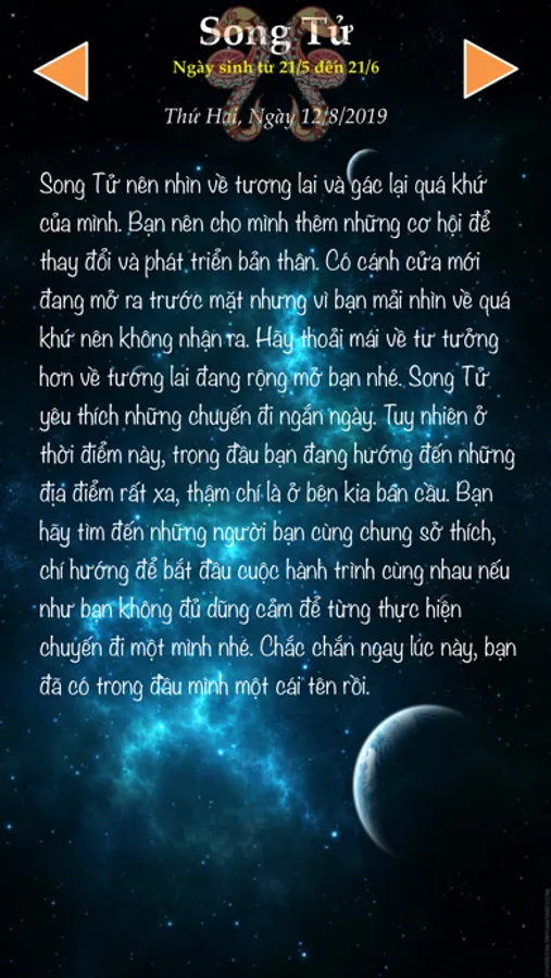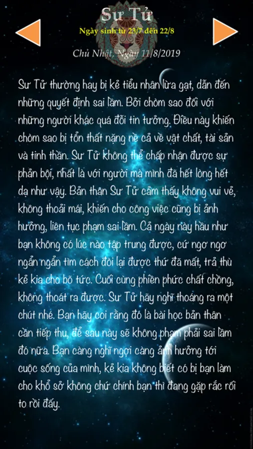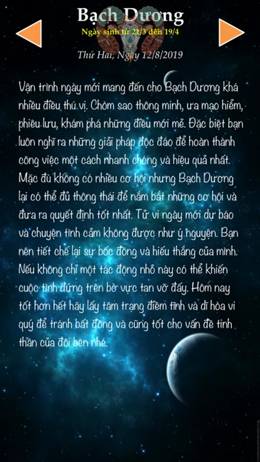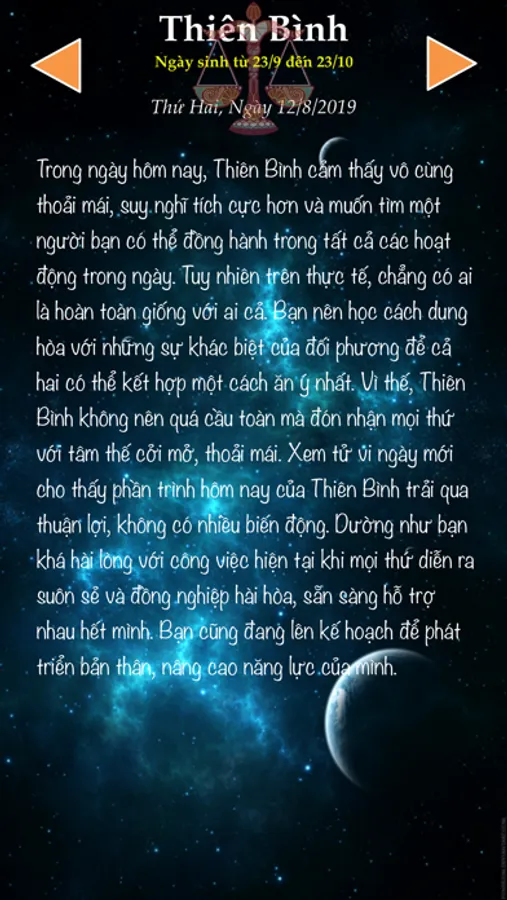 - Ứng dụng xem tử vi 12 Cung Hoang Dao Hang Ngay sẽ đưa ra dự đoán chính xác ngày hôm nay của 12 cung hoàng đạo. Bạn có thể tra cứu lại các ngày trong quá khứ và hiện tại. Ứng dụng nhỏ gọn, tuyệt vời và hoàn toàn miễn phí.