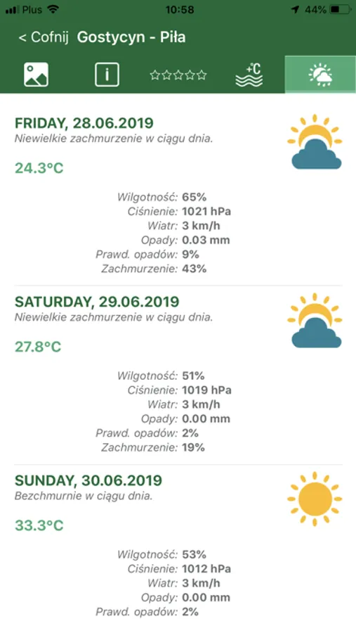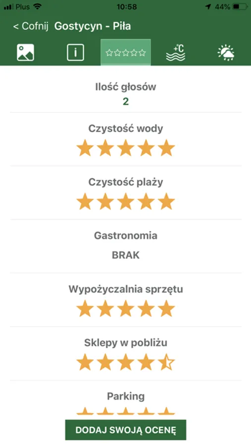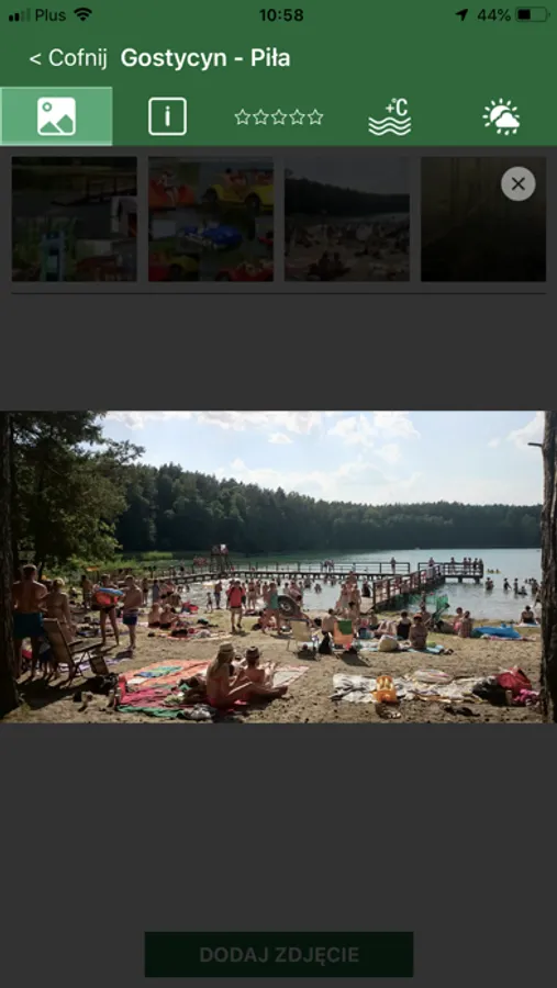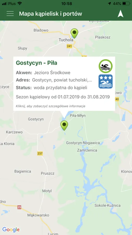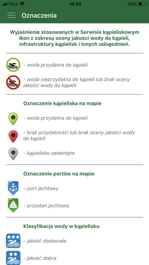 Podstawową funkcją jest znalezienie kąpieliska na mapie, z możliwością wyświetlenia informacji o nim - krótki opis, infrastruktura oraz galeria zdjęć. Aplikacji pozwala również na pokazanie trasy dojazdu z miejsca, w którym aktualnie się znajdujemy. Dodatkowo po wybraniu województwa pojawia się nam lista wszystkich monitorowanych kąpielisk, na jego terenie.