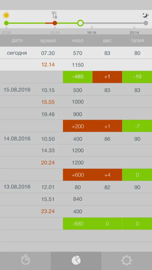В начале дня, во время ЗАВТРАКА, Вы также сможете ввести свой вес и объём талии. После первого ввода значений, Вы сможете наблюдать ежедневную динамику изменений Вашего тела.